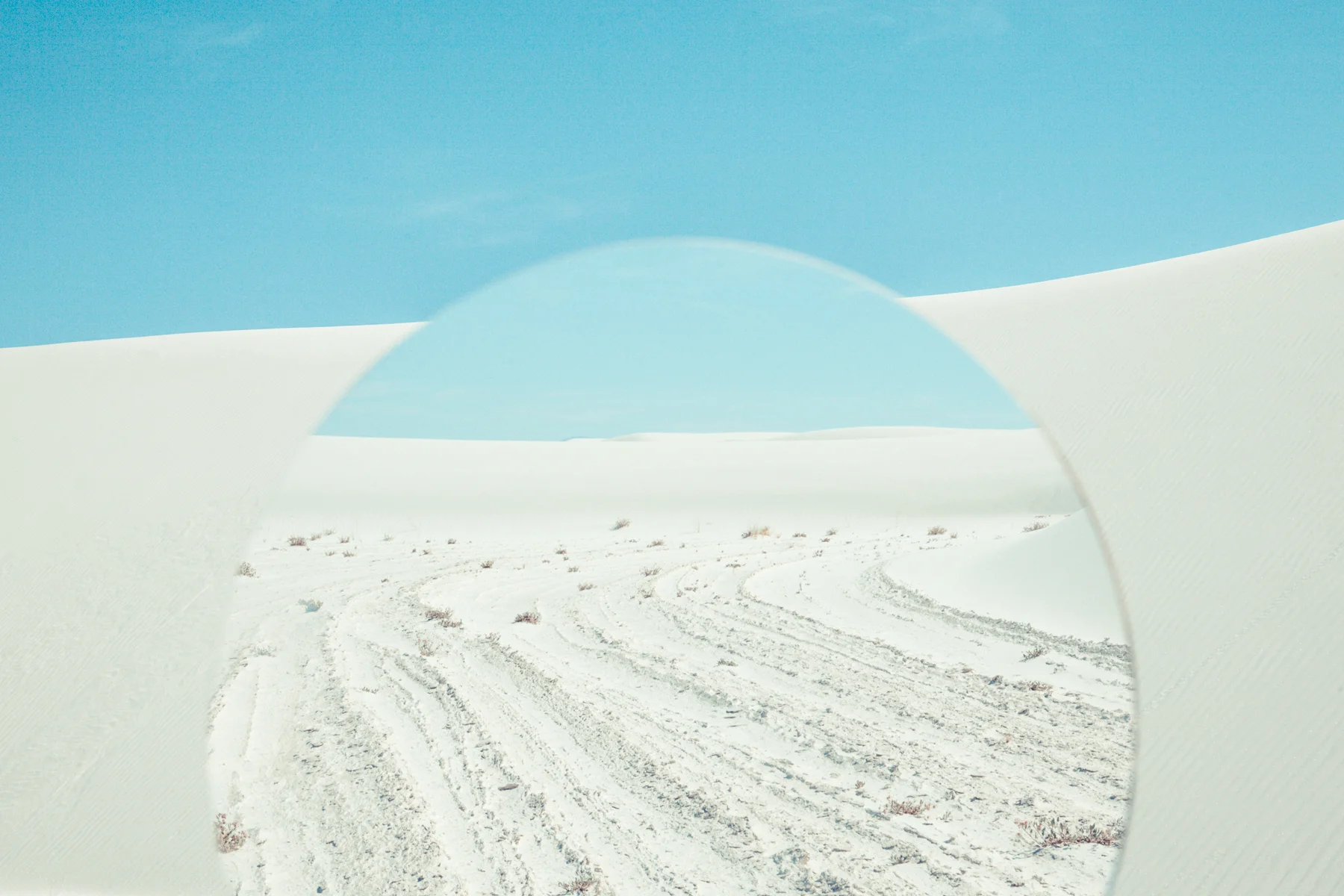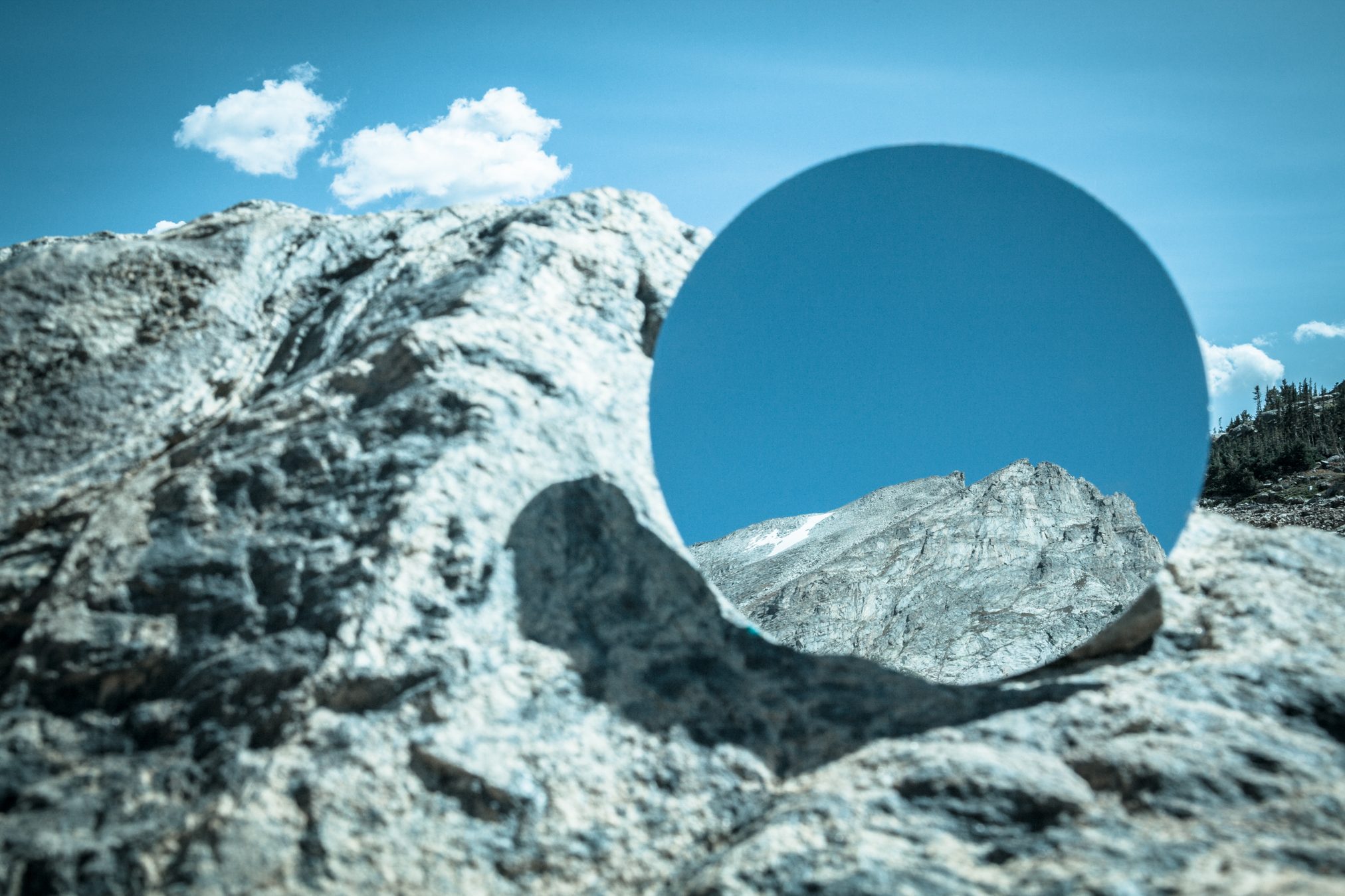 This series began with a question. How can I show the expansive space all around me in a single two-dimensional image? How can I move beyond the singular vantage point of traditional photography? After some experiments, I realized I could use a mirror in the landscape to join the space behind me with the space in front of me. The series clicked into place when I joined the horizon line behind me to the one in front of me. In this way, I create a temporary landscape that exists only in the captured image. The title refers to the sensation of being able to sense in all directions even if my eyeballs and my camera can only see in one. I began the project using a circular mirror as a reference to the shape of the eyeball and the fact that all images are projected as true circles and then cropped by the camera. I have branched out into using front-surface (better optical quality) square mirrors as well as cracked and broken mirrors. The rectangular mirror is something inside all single lens reflex cameras (SLRs). Here I am adding an exterior mirror to extend the “seeing” capacity of the camera.
